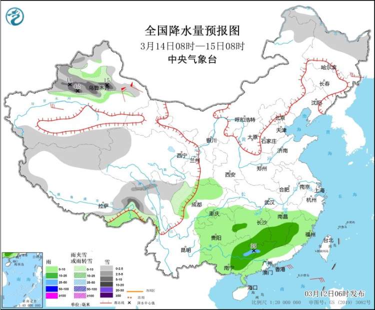 根据中央气象台预报,3月12日08时至13日08时,西藏北部和东部、青海南部、甘肃南部、陕西北部、川西高原中北部等地部分地区有小雪或雨夹雪,其中,西藏东北部、青海东部、甘肃南部等地部分地区有中到大雪。西北地区东南部、江汉西部、江南北部和西部、西南地区东部、华南西部等地部分地区有小到中雨,其中,贵州中北部等地部分地区有大雨。