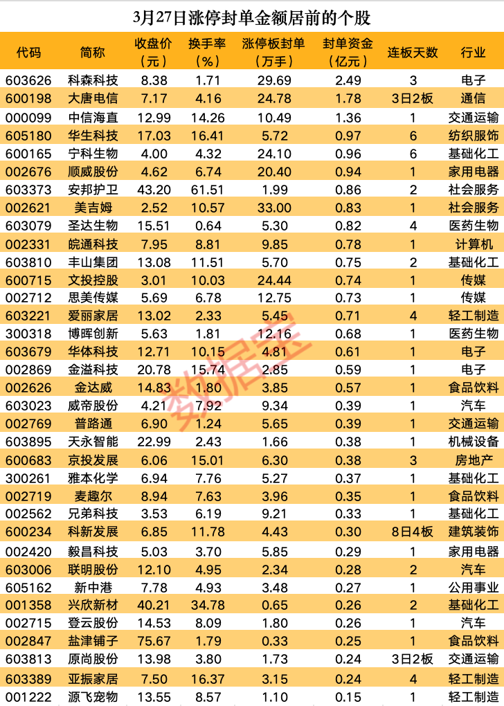 以封单金额计算,3股封单金额超亿元,科森科技、大唐电信、中信海直封单金额居前,分别为2.49亿元、1.78亿元、1.36亿元。